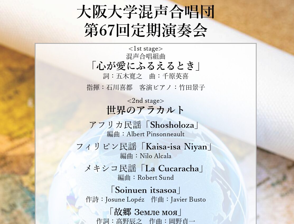 客演指揮者に髙谷光信先生、客演ピアノに竹田景子先生をお迎えし、1年間の集大成を3ステージ構成でお届けします!正指揮者ステージの世界のアラカルトでは、昨年度から取り組んできたバスク語をはじめ、様々な言語に挑戦します🌏